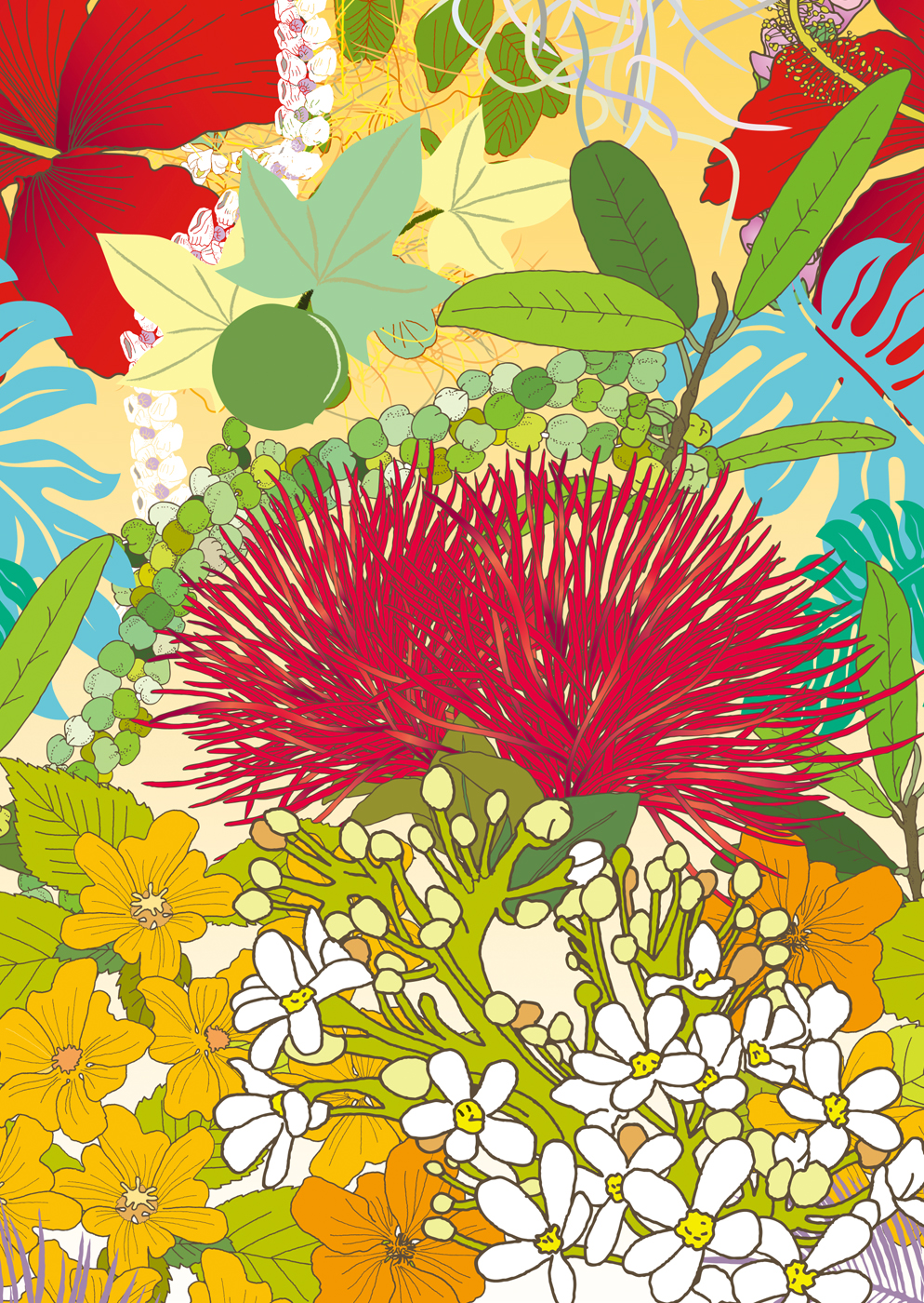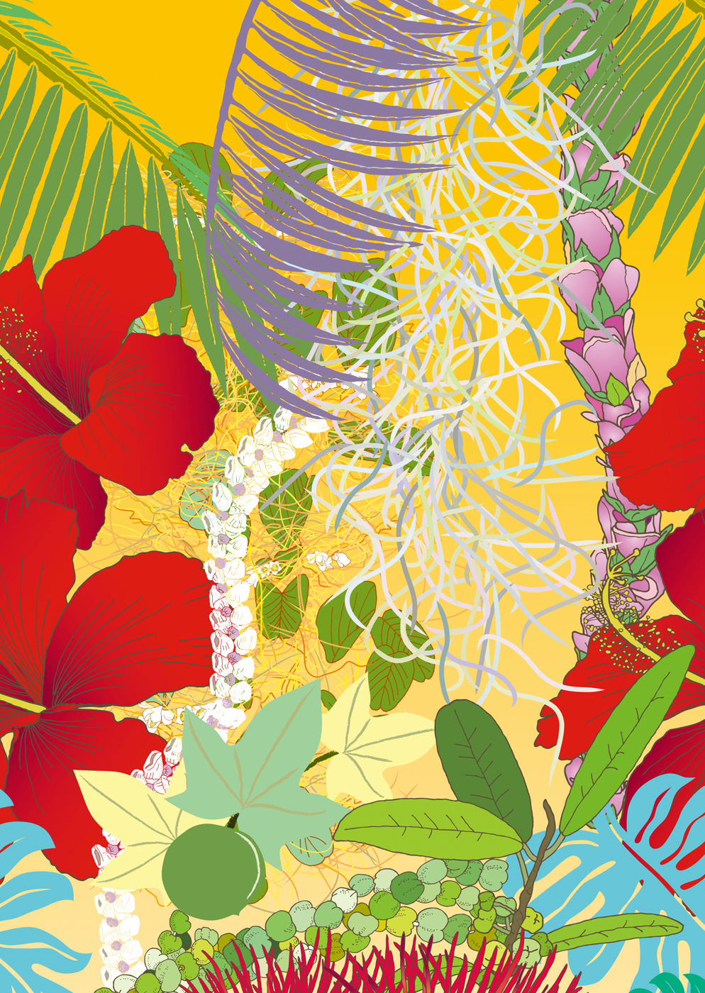 ハワイの8島を表すモチーフ、ハワイ島=オヒアレフア、カホラヴェ島=ヒナヒナ、マウイ島=ロケラニ、ラナイ島=カウナオア、モロカイ島=ククイ、オアフ島=イリマ、カウアイ島=モキハナ、ニイハウ島=ププ(シェルレイ)と、日本で人気のあるモチーフ、ハイビスカス、モンステラ、ココナッツリーフを加えた全11種の柄で、ハワイをイメージさせた、オールマイティーなデザインです。
